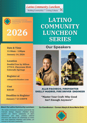 The Colorado Springs Latino Community Luncheon powered by the Colorado Springs Hispanic Chamber brings together our diverse community to share information and ideas, promote cultural awareness and educate the community on the events and issues impacting Hispanics | Latinos in El Paso County. The Latino Community Luncheon is open to the public.